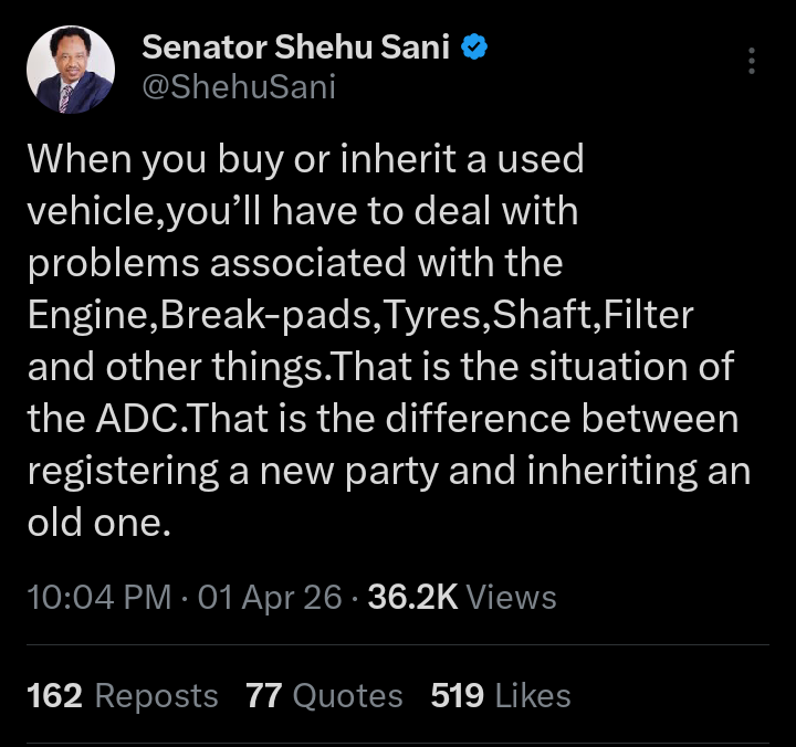 In his response, Senator Shehu Sani compared the situation in the African Democratic Congress to owning a second-hand car. The former Kaduna lawmaker pointed out that starting a new party is more advantageous than taking over an older one.