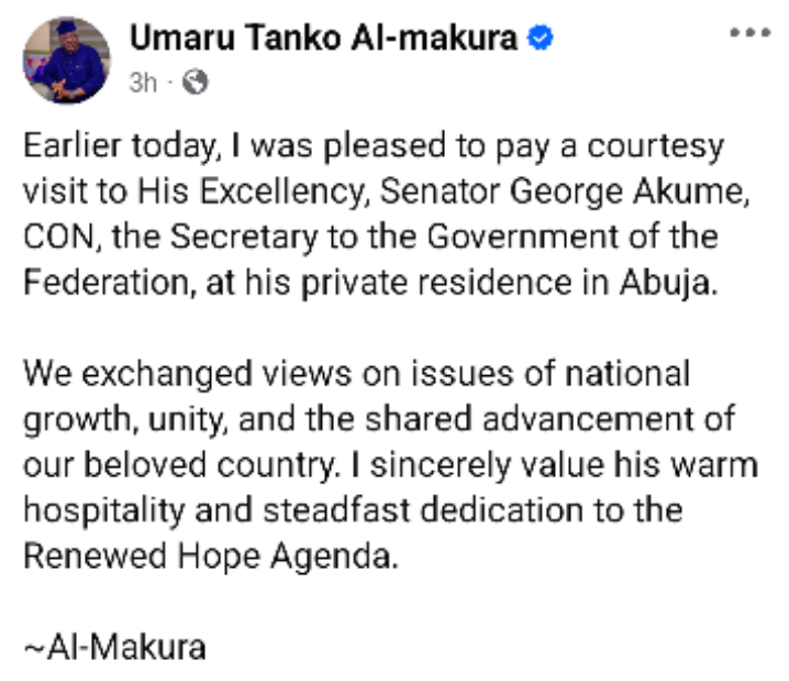 The former executive Governor of Niger State and chieftain of the All Progressives Congress, Umaru Tanko Al-makura stated on his verified Facebook page on Friday; “Earlier today, I was pleased to pay a courtesy visit to His Excellency, Senator George Akume, CON, the Secretary to the Government of the Federation, at his private residence in Abuja.”