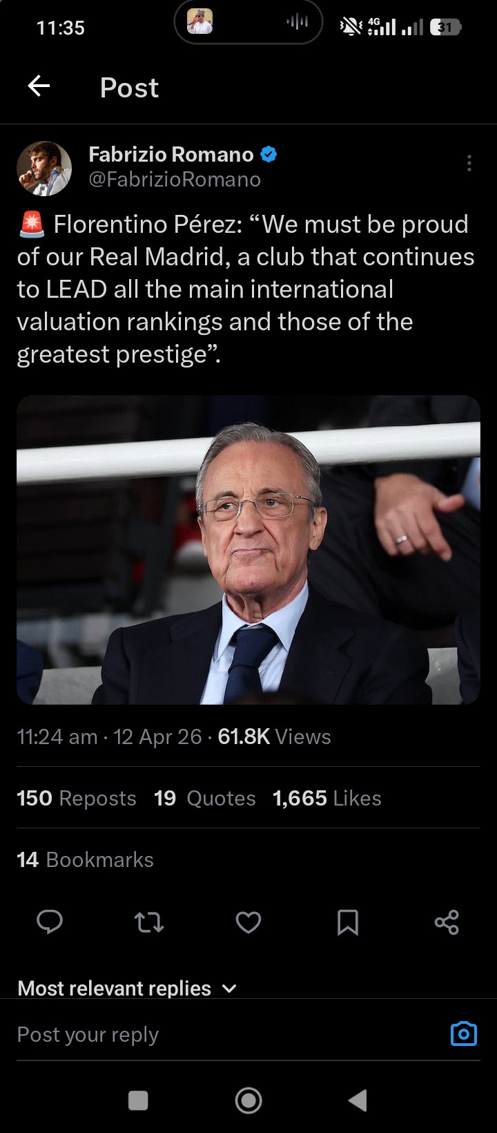 In a recent statement shared by transfer expert Fabrizio Romano on April 12, 2026, Pérez highlighted Real Madrid’s consistent leadership in international valuation rankings and its enduring prestige in world football.