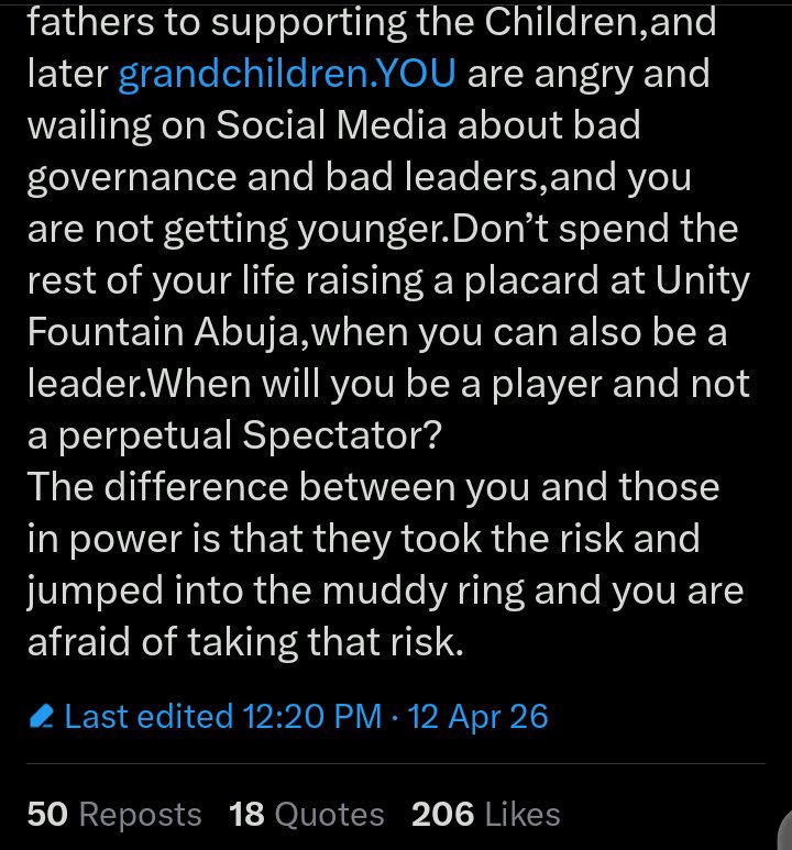 However, the post generated mixed reactions from social media users who expressed differing opinions about his remarks. While some users agreed that Nigerians need to be more politically engaged, others argued that systemic challenges, lack of trust in political institutions, and limited opportunities discourage many citizens from active participation.