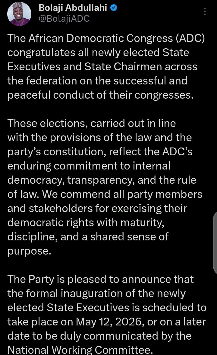 “The African Democratic Congress (ADC) congratulates all newly elected State Executives and state chairmen across the federation on the successful and peaceful conduct of their congresses”.