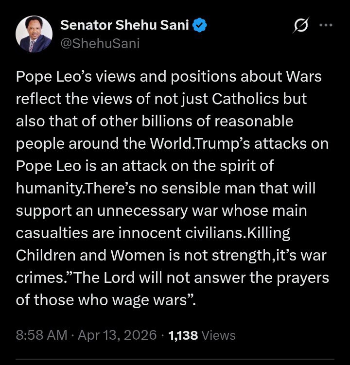 Summing up his position, Sani declared that criticism directed at the Pope over his anti-war stance ultimately reflects a deeper disregard for human dignity, insisting that the loss of innocent lives should never be normalized or defended under any circumstance.