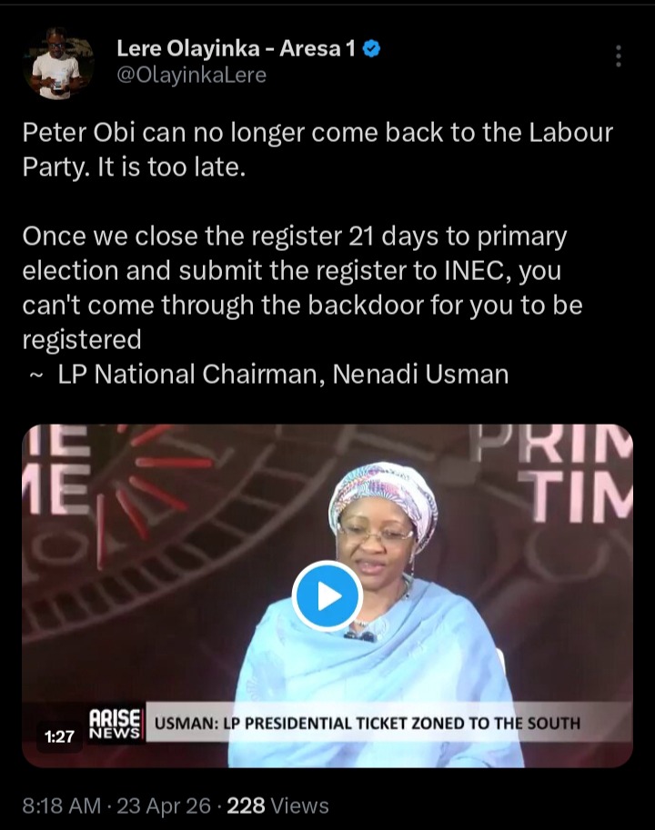 According to Lere Olayinka, the new rule signified that the 2023 presidential candidate of the party, Peter Obi cannot make a last minute return. The former governor, it can be recalled, was expected to make a return if he failed to secure the ADC presidential ticket.