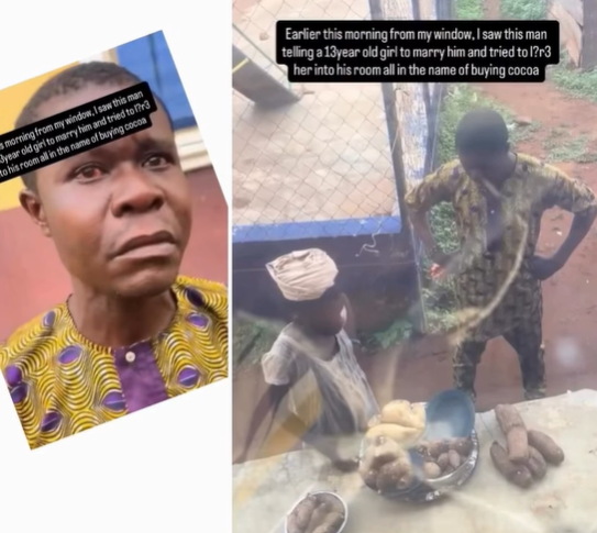 A local resident witnessed the suspected pedophile attempt to lure the young girl hawking cocoyam into his room, recording the incident from his window to secure evidence. After filming, the witness came out of his house and confronted the suspect directly.