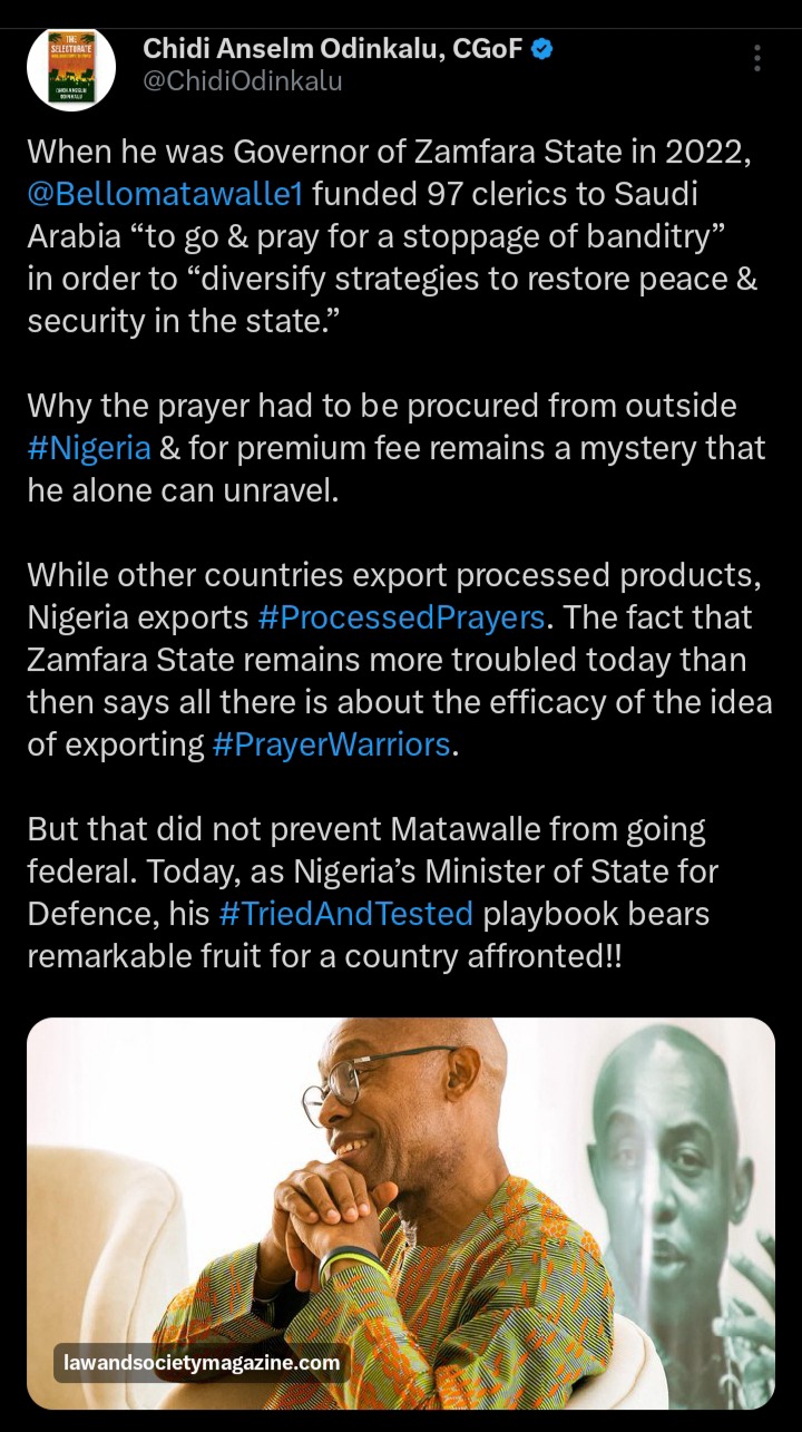 Chidi Odinkalu, a renowned human rights activist and former chairman of the national human rights commission has taken to his official X handle to disclose the actions taken by Bello Matawalle to restore peace in Zamfara State in 2022. According to his statements, he pointed out that the former governor funded ninety seven clerics to pray against bandits activities.