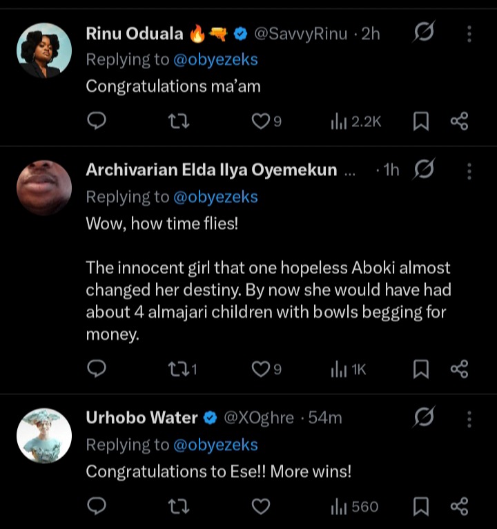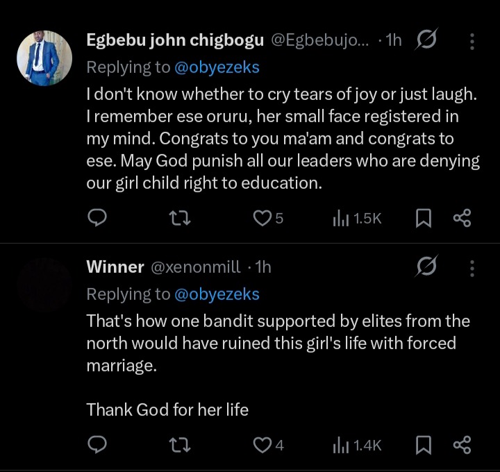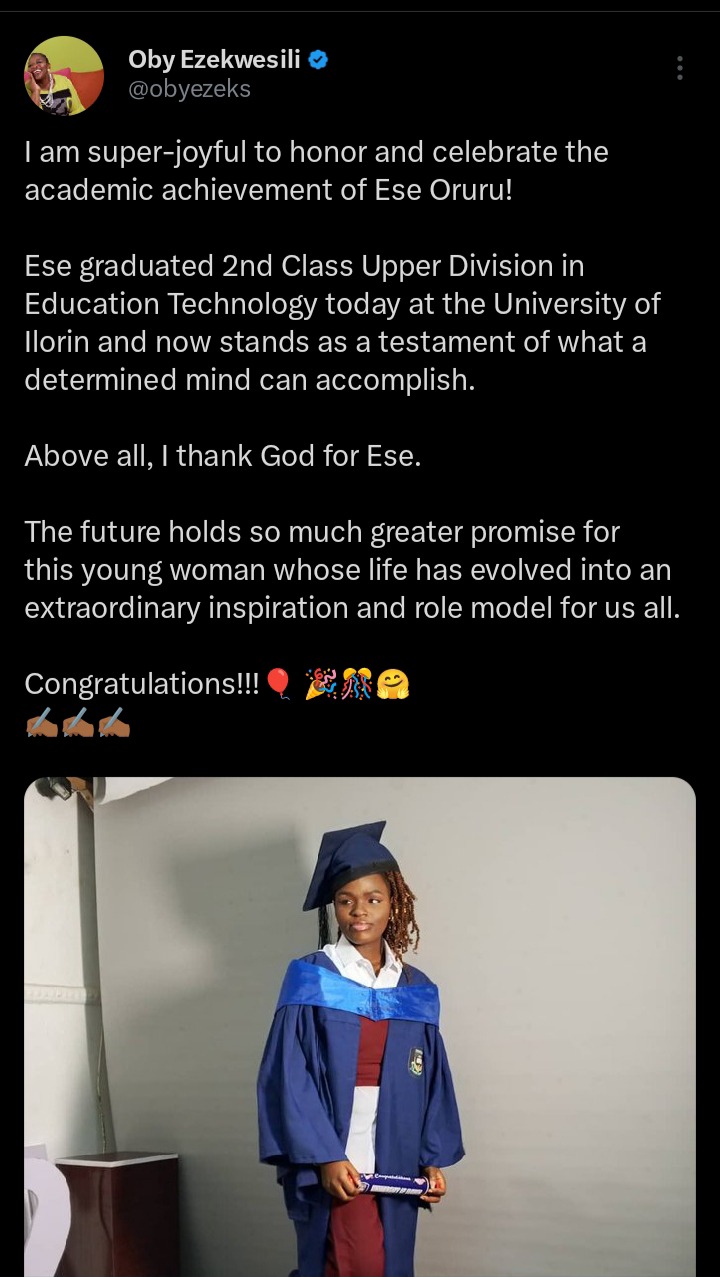 There have been several reactions from the general public and particularly social media users after the former minister for Education, Oby Ezekwesili commented on the achievement recorded by Ese Oruru, a young girl who was rescued from bandits. According to the statements which were shared on her official X handle, he disclosed that the young girl graduated with second class upper division from the University.