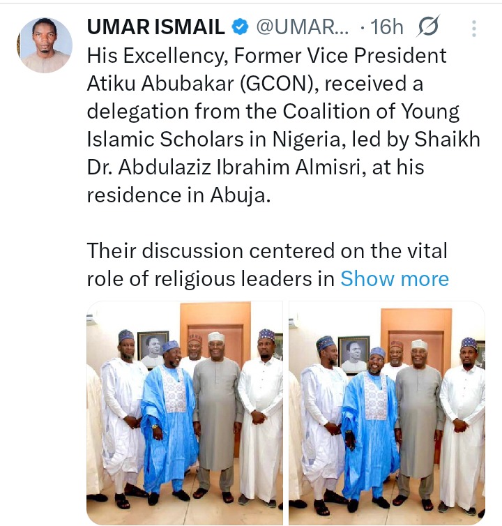 According to a media post on Friday, 24 October 2025, by the Media Aide to the former Vice President, Honourable Umar Ismail, His Excellency, Former Vice President Atiku Abubakar (GCON), received a delegation from the Coalition of Young Islamic Scholars in Nigeria, led by Sheikh Dr. Abdulaziz Ibrahim Almisri, at his residence in Abuja.