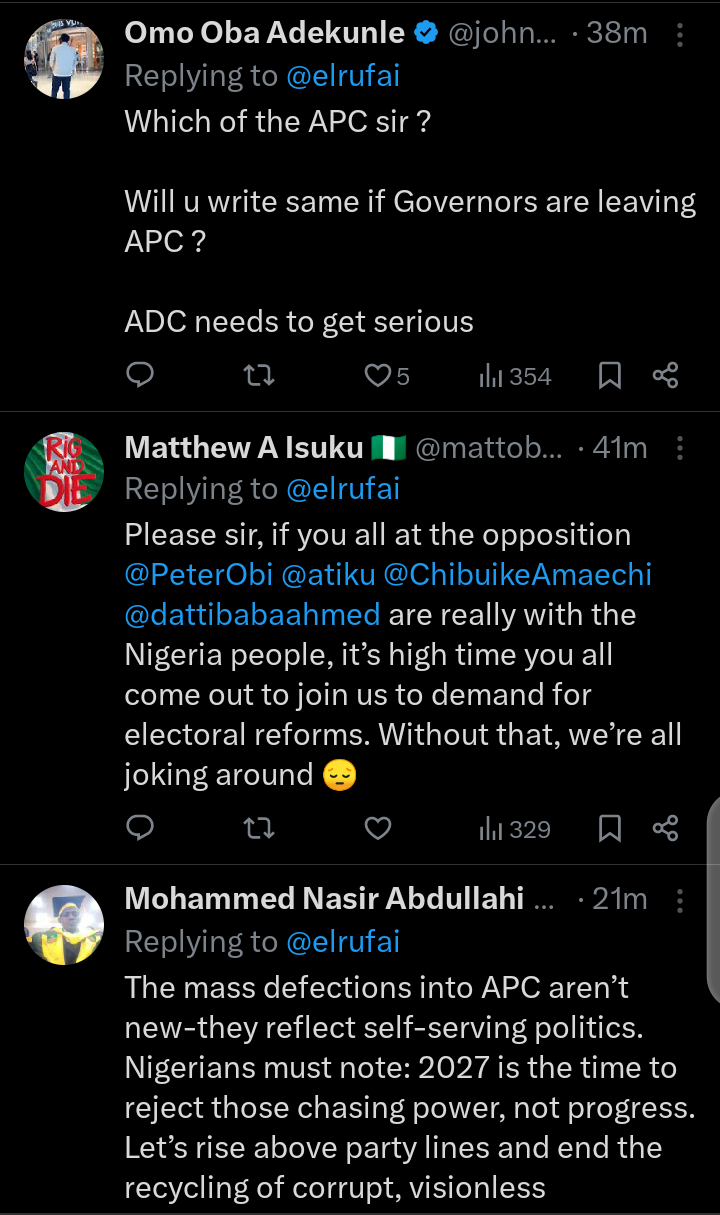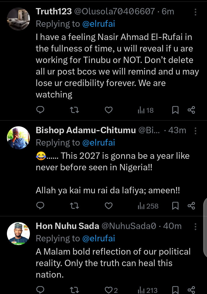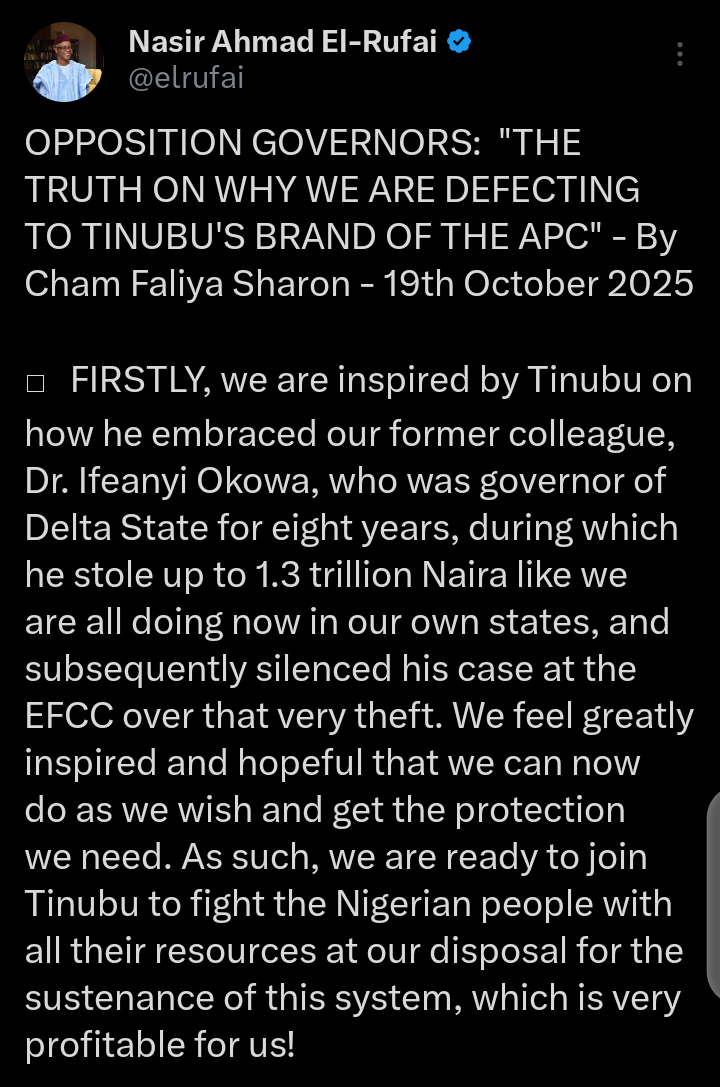 Social media users have taken to their official X account on Tuesday, October 21, 2025 to react to the report that former governor of Kaduna state and one of the chieftains of the Social Democratic Party, SDP, Mallam Nasir El-Rufai, shared on his official X account.