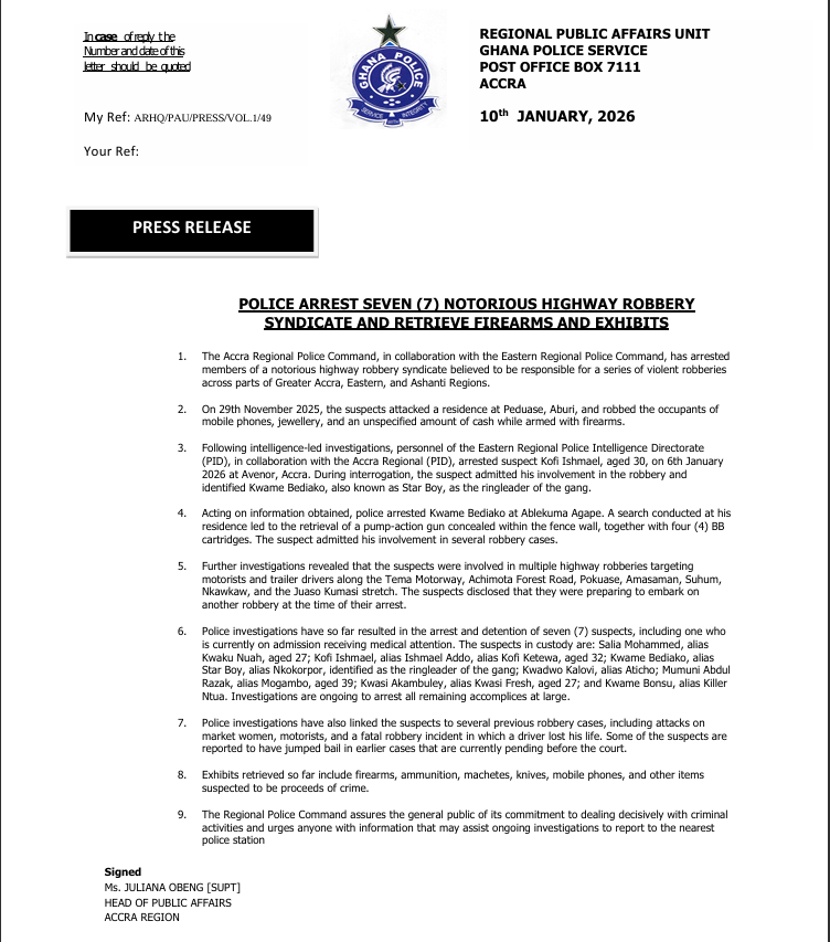 According to a police statement signed by Superintendent Juliana Obeng, Head of the Public Affairs Unit of the Accra Region and issued on Saturday January 10, 2026, the arrests followed intelligence-led investigations into a robbery attack carried out on November 29, 2025, at a residence in Peduase, Aburi.