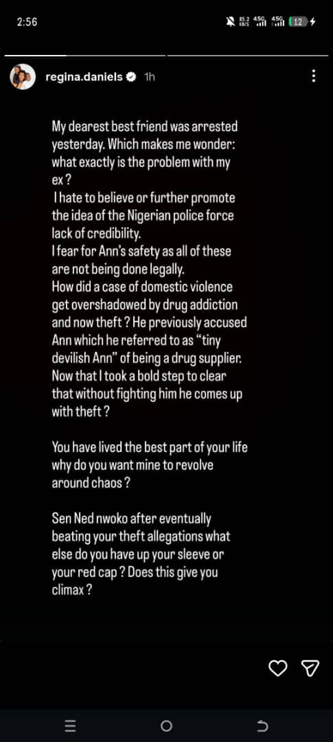 Naija News reports that in a series of Instagram story posts shared on Tuesday, Regina questioned the reason behind Ann’s arrest and linked it to her personal issues with her estranged husband, Senator Ned Nwoko.