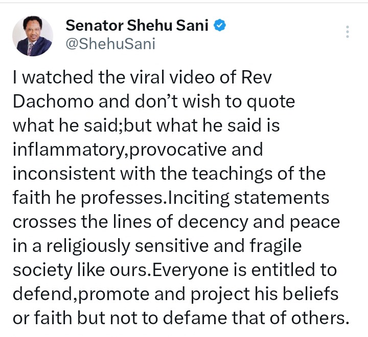 “I watched the viral video of Rev Dachomo and don’t wish to quote what he said; but what he said is inflammatory, provocative and inconsistent with the teachings of the faith he professes,” Sani wrote.