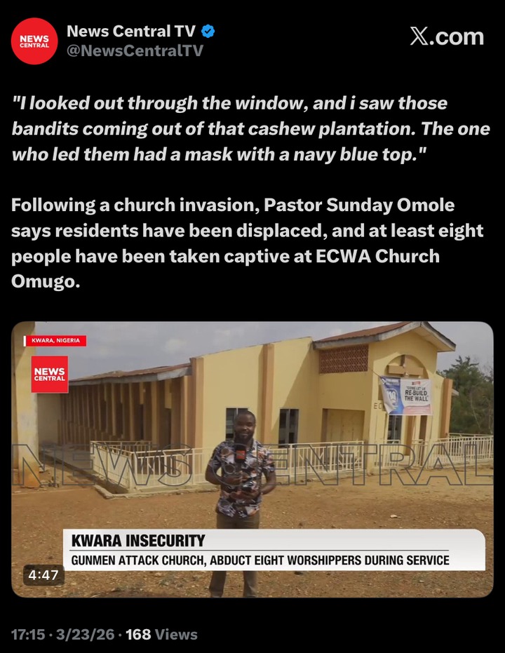 Following an armed attack at ECWA Church Omugo in Irepodun Local Government Area of Kwara State, residents have been forced to flee, and at least eight people were reportedly taken captive, authorities and eyewitnesses said. The incident occurred during a weekly church service left the community shaken.