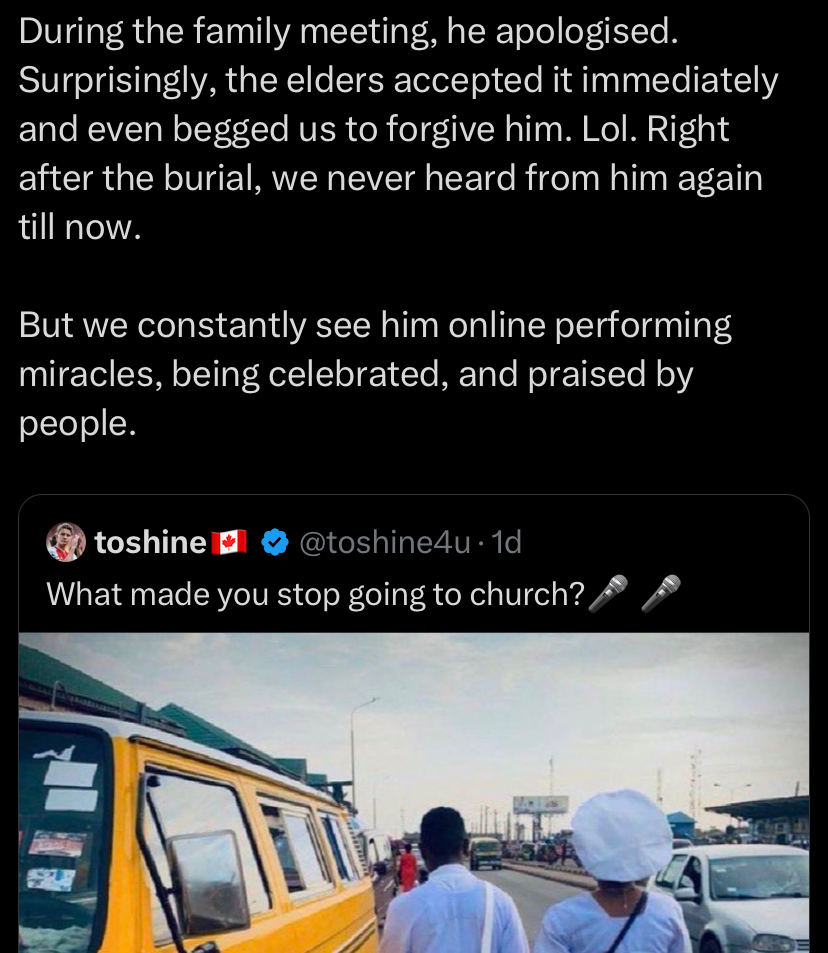 She wrote: “I stopped going to church because of my brother. I only returned about two years ago. Back then, everything about church irritated me. My brother, the first son in our family is a well-known and successful pastor in Edo State, living very comfortably.”
