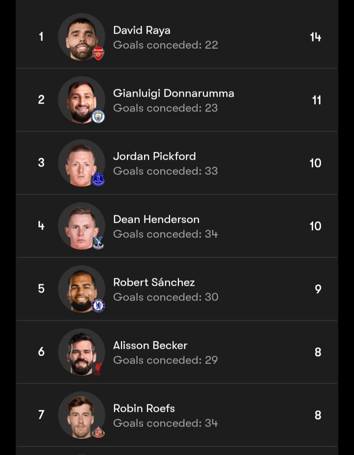 Top clean sheets: