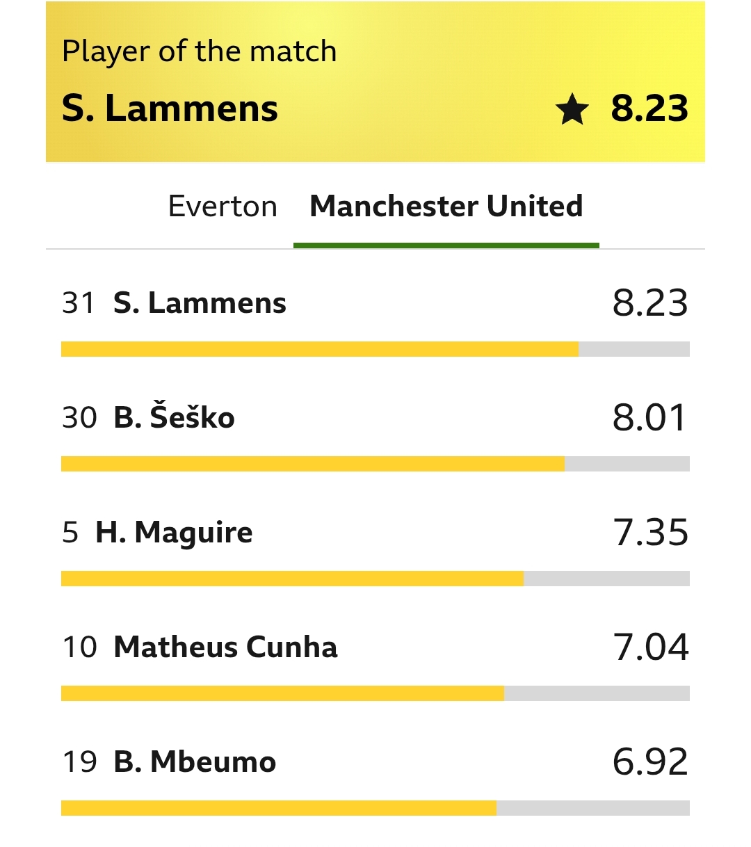 Manchester United goalkeeper Senne Lammens delivered a standout performance at the Hill Dickinson Stadium as he secured the Player of the Match award with a rating of 8.23, helping seal a hard-fought 1–0 win over Everton.