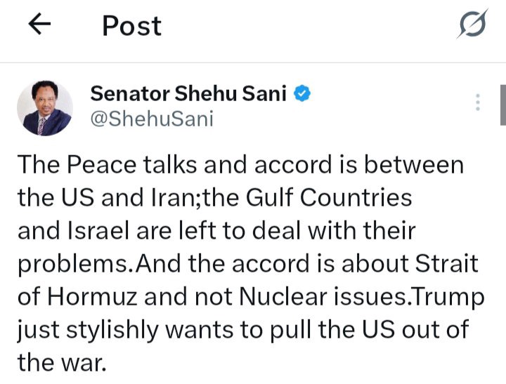 In a post on his X (formerly Twitter) account on Monday, April 6, 2026, Sani stated that the peace talks between the two countries are not truly about nuclear weapons, as commonly believed, but about restoring access to the Strait of Hormuz, a vital route for global oil shipments.