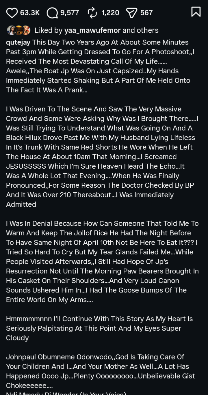 “This day two years ago at some minutes past 3pm while getting dressed to go for a photoshoot, I received the most devastating call of my life. Awele, the boat JP was on just capsized, my hands immediately started shaking but a part of me held onto the fact it was a prank. Johnpaul Obumneme Odonwodo, God is taking care of your children and I, and your mother as well”, Qutejay wrote and it stirred massive reactions from the general public.