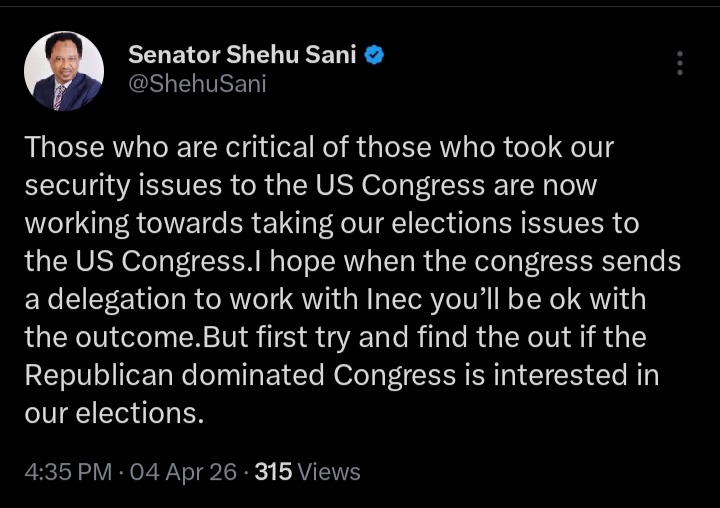 “Those who are critical of those who took our security issues to the US Congress are now working towards taking our elections issues to the US Congress. I hope when the Congress sends a delegation to work with INEC you’ll be ok with the outcome. But first try and find out if the Republican dominated Congress is interested in our elections.” He wrote.