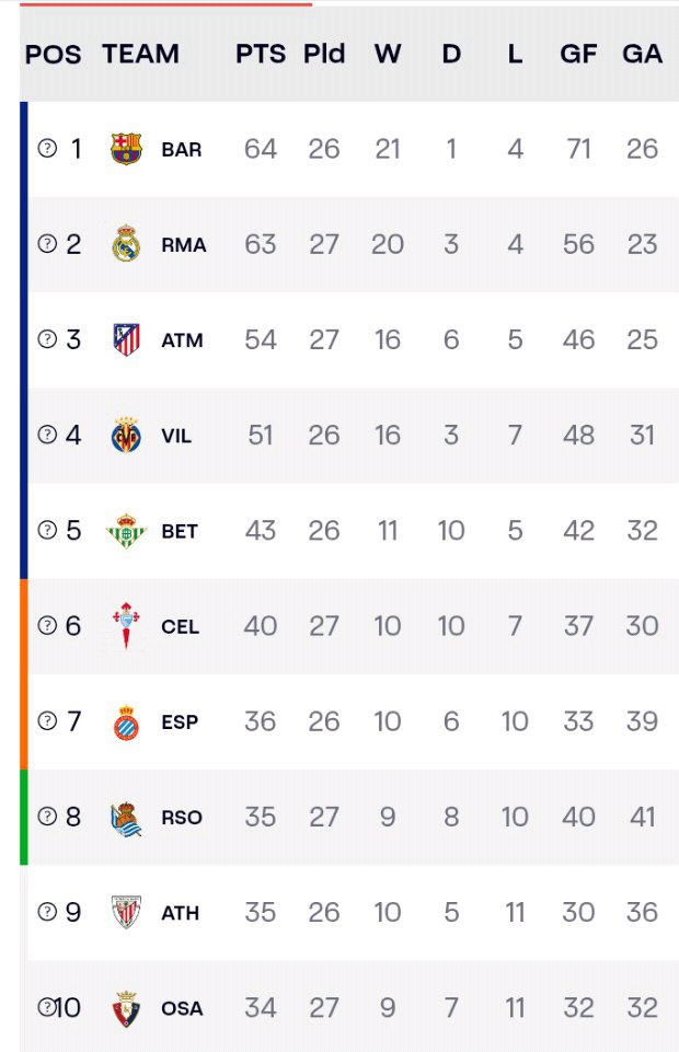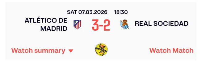 This victory moves Diego Simeone’s team to third place in the table, trailing Barcelona by 10 points. Real Sociedad stays in eighth position, 29 points behind the leaders, meaning they must improve their results to remain in contention for a European competition spot.