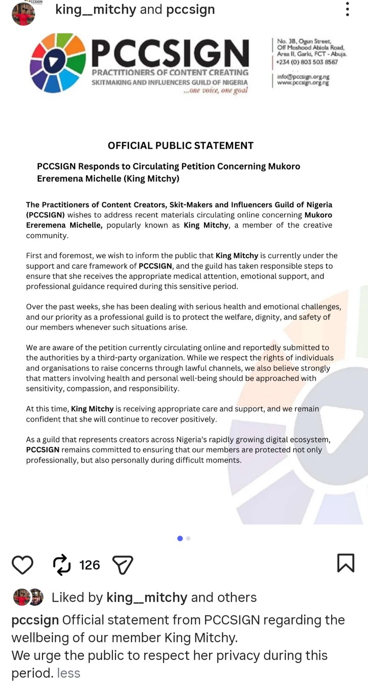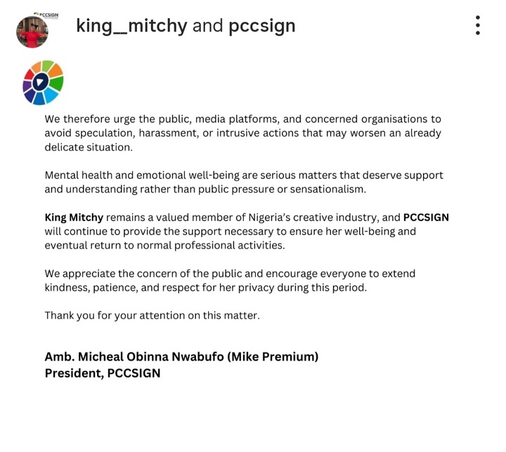 According to PCCSIGN, King Mitchy is currently under the guild’s support and care framework. The organisation stated that it has taken responsible steps to ensure she receives appropriate medical attention, emotional support and professional guidance during this period.