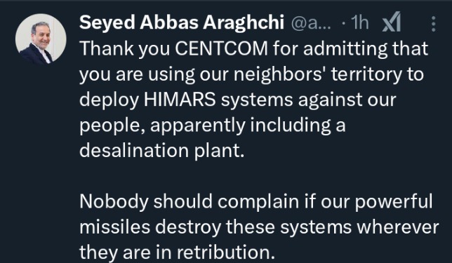 In his post, Araghchi stated: “Thank you CENTCOM for admitting that you are using our neighbors’ territory to deploy HIMARS systems against our people, apparently including a desalination plant. Nobody should complain if our powerful missiles destroy these systems wherever they are in retribution.”