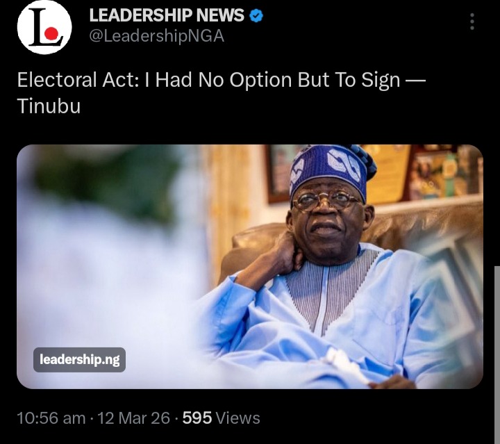 President Bola Tinubu on Wednesday defended his decision to sign the Electoral Act 2026 into law, declaring that he had “no option” but to assent to the legislation after it was passed with an overwhelming majority by the National Assembly.
