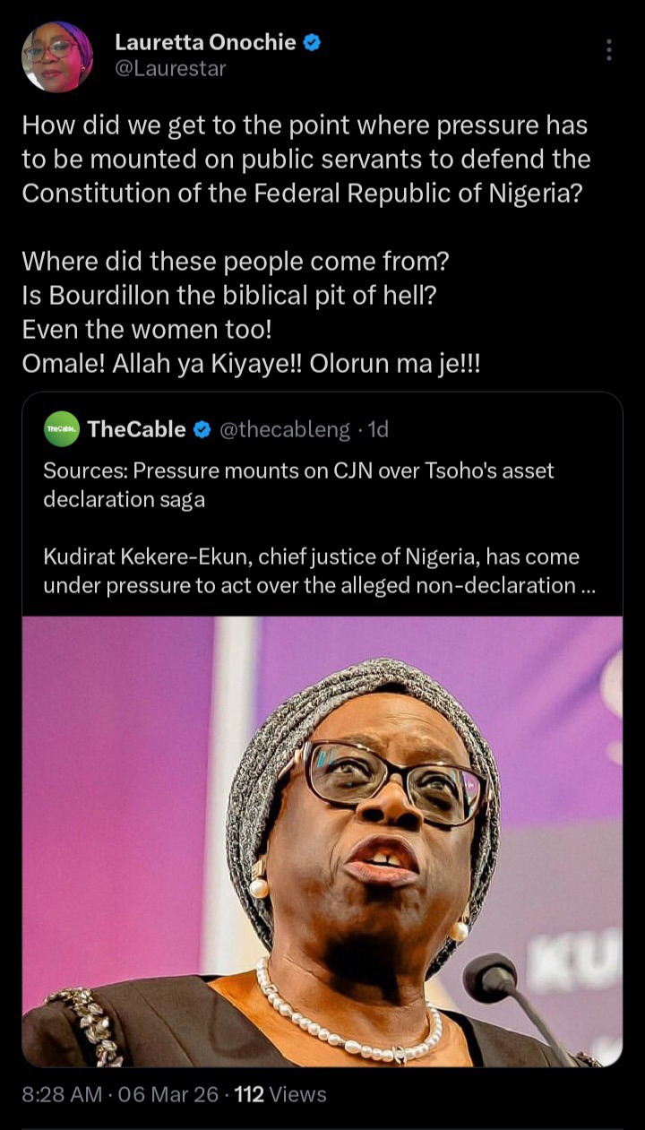 Reports that appeared on TheCable’s official X account on Thursday, March 7th, 2026, indicated that there was increasing pressure on the Chief Justice of Nigeria, Justice Kudirat Keke-Ekun, to take appropriate action.