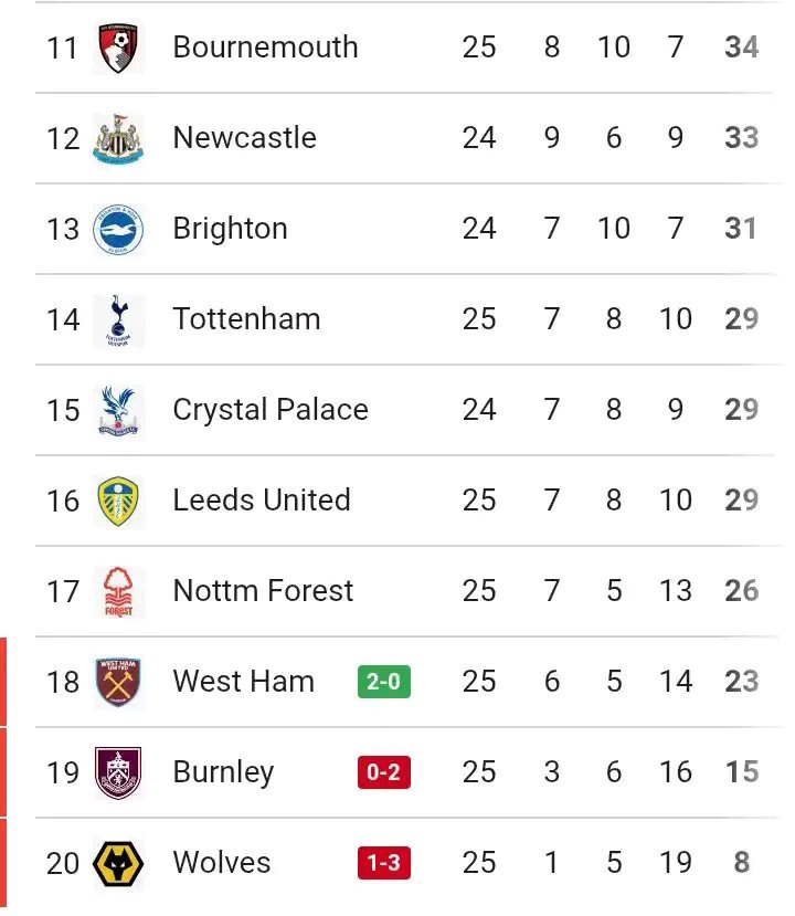 At the top of the table, Arsenal remain leaders with 56 points from 25 matches, having recorded 17 wins, five draws, and three defeats. Manchester City sit second on 47 points from 24 games, level on points with Aston Villa in third. Manchester United occupy fourth place with 44 points.